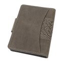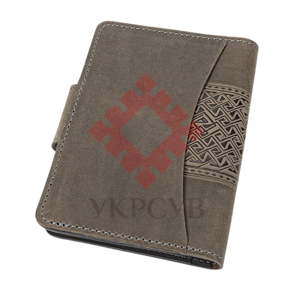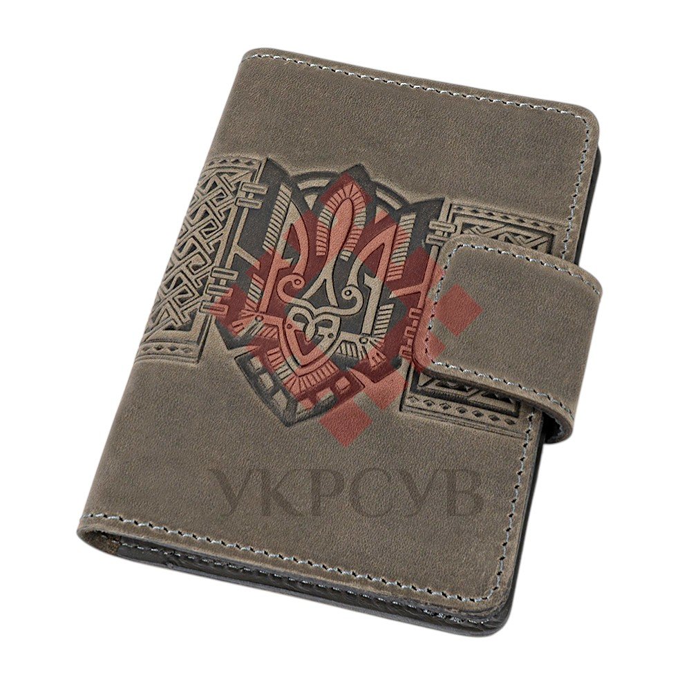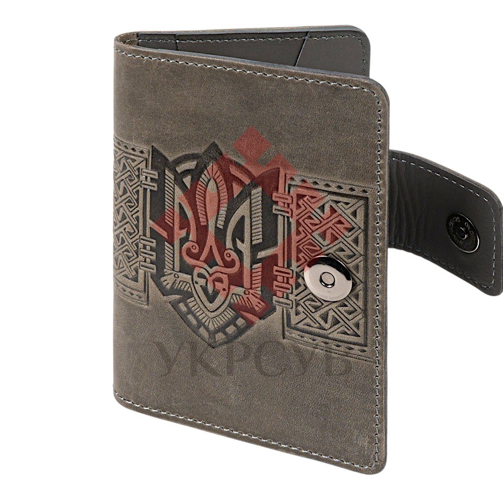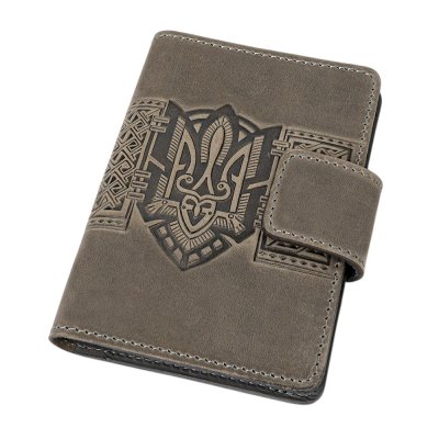 Обкладинка для документів "Тризуб", сірийСтильна обкладинка для документів із виразним тисненням у вигляді Тризуба — символу сили, свободи та української ідентичності. Орнаментальні елементи гармонійно доповнюють композицію, створюючи глибокий і впізнаваний дизайн. Виріб виготовлений зі 100% натуральної шкіри, яка відзначається довговічністю та приємною текстурою. Завдяки продуманій конструкції обкладинка забезпечує надійний захист документів і зручне користування щодня. Функціональні внутрішні відділення дозволяють акуратно розмістити необхідні документи, а застібка на кнопці гарантує їх безпечне зберігання. Це не просто практичний аксесуар, а виразний елемент стилю з українським характером.